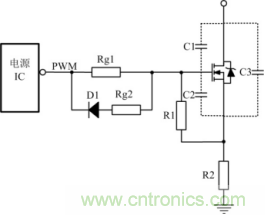 關斷瞬間驅(qū)動電路能提供一個盡可能低阻抗的通路供MOSFET柵源極間電容電壓快速泄放,保證開關管能快速關斷。為使柵源極間電容電壓的快速泄放,常在驅(qū)動電阻上并聯(lián)一個電阻和一個二極管,如圖3所示,其中D1常用的是快恢復二極管。這使關斷時間減小,同時減小關斷時的損耗。Rg2是防止關斷的時電流過大,把電源IC給燒掉。