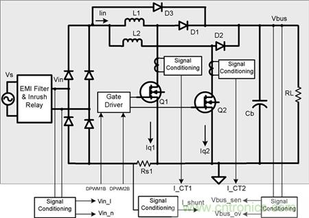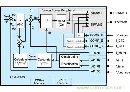 您可以看到固件外部仍有可使用示波器進(jìn)行監(jiān)控的模擬信號(hào)。另外,您是否注意到方框底部輸出的信號(hào)?這些信號(hào)將進(jìn)入 UCD3138 數(shù)字控制器并由固件處理,請(qǐng)看下圖。
