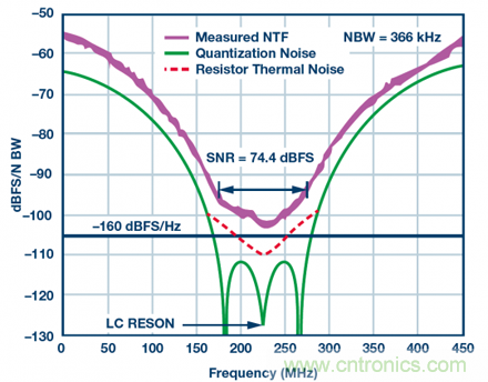 即使不進(jìn)行完整分析,也可以看到,對(duì)于Σ-Δ型調(diào)制器,使用NSD作為確定帶內(nèi)可用動(dòng)態(tài)范圍的規(guī)格尤為有效。圖4顯示的是高速帶通Σ-Δ型ADC放大后的噪底曲線。在75 MHz目標(biāo)頻段內(nèi)(中心頻率為225 MHz),噪聲為-160 dBFS/Hz左右,SNR超過(guò)74 dBFS。