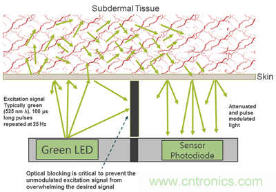 圖1展示了測量心率信號的基本方法,它依賴于用光學(xué)方法從人體組織上提取的心率壓力波。圖1說明了光進(jìn)入皮膚后傳輸?shù)耐緩剑河尚穆蕢毫Σㄒ鸬拿?xì)血管舒張和收縮運(yùn)動(dòng)對由綠色LED注入人體組織的光信號進(jìn)行了調(diào)制。接收到的信號因?yàn)橥ㄟ^了皮膚而被大大地衰減,它被一個(gè)光電管接收并送到電子子系統(tǒng)中去處理。源自脈搏的振幅調(diào)制信號被檢測(過濾掉運(yùn)動(dòng)噪聲)、分析和顯示。