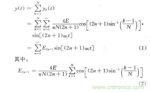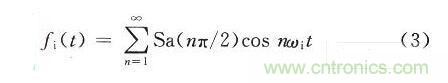 首先對量化過程進行分析,現(xiàn)假設基帶輸入信號為一個正弦信號gi(t)=Esinωit,量化位數(shù)為N,經(jīng)過量化后的信號可用階梯波y(t)表示,y(t)可以被認為是N對矩形波的疊加。如果A/D變換的量化位數(shù)為m,那么正或負半周的量化臺階數(shù)為N=2m-1。階梯波的表達式為: