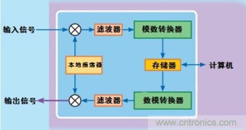 數(shù)字射頻存儲(DRFM)的基本工作原理:首先將輸入射頻信號下變頻為中頻信號,經(jīng)A/D變換后成為數(shù)字信號,寫入高速存儲器中。當需要重發(fā)這一信號時,在控制器控制下讀出此數(shù)字信號并由D/A變換為模擬信號。然后用同一本振作上變頻,得到射頻輸出信號,完成對輸人信號的存儲轉(zhuǎn)發(fā)。