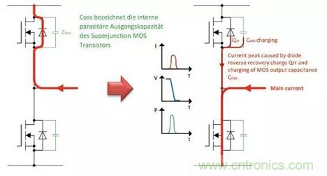 在導(dǎo)通期間,該電壓依賴性導(dǎo)致?lián)p耗誘導(dǎo)的充電電流的主要部分流過Q1的低VDS。然而,Q1兩端的低電壓意味著半橋?qū)ǖ牡投司w管有著高電壓導(dǎo)通。由于充電電流峰值,導(dǎo)致晶體管的導(dǎo)通損耗很高。