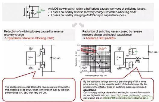 同步反向阻斷(SRB)串聯(lián)第二開關(guān)晶體管Q2以阻斷開關(guān)晶體管Q1的續(xù)流二極管中的反向電流。Q2的激活與Q1同步。反向電流通過并聯(lián)的碳化硅(SiC)肖特基二極管,該二極管具有高擊穿電壓和極低的反向恢復(fù)電荷,這大大降低了Qrr對(duì)開關(guān)損耗的影響。Q2的續(xù)流二極管的極性確保晶體管不能產(chǎn)生高電壓,因此,低介電強(qiáng)度(60 V)的型款就足夠了。