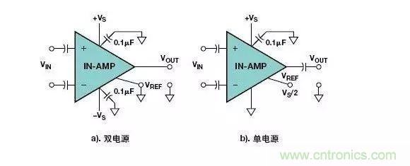 類似的問題也會出現(xiàn)在儀表放大器電路中。圖3示出了使用兩只電容器進行AC耦合的儀表放大器電路,沒有提供輸入偏置電流的返回路徑。這個問題在使用雙電源(圖3a)和單電源(圖3b)供電的儀表放大器電路中很常見。