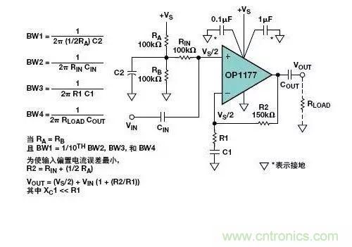 最后,單電源運算放大器電路需要偏置共模輸入電壓幅度以控制AC信號的正向擺幅和負向擺幅。當從電源電壓利用分壓器提供偏置電壓時,為了保證PSR的性能就需要合適的退耦。