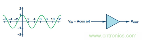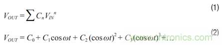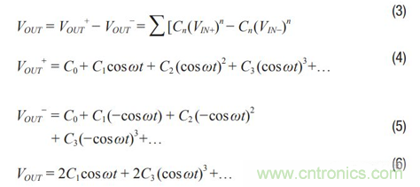 差分信號可抑制偶數階諧波。以下展示了連續(xù)波(CW)通過一個 增益模塊的示例。當使用一個單端放大器時,如圖2所示,輸出 可表示為公式1和公式2。