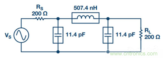 CSCALED為最終電容值。LSCALED為最終電感值。Cn為低通原型電容元件值。Ln為低通原型電感元件值。RL為最終負載電阻值。fc 為最終截止頻率。C1SCALED = 1.433/(2π × 100 × 106 × 200) = 11.4 pFL2SCALED = (1.594 × 200)/(2π × 100 × 106) = 507.4 nHC3SCALED = 11.4 pF