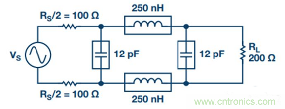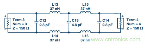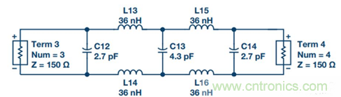 2. 將單端濾波器變?yōu)椴罘譃V波器。源阻抗和負載阻抗保持不變,所有電容并聯,所有串聯電感減半并放在另一差分路徑中(參見圖17)。