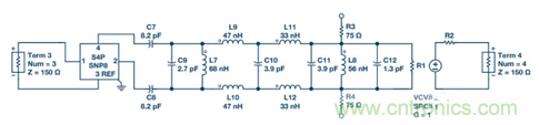4. 對于子系統(tǒng)級仿真,應在輸入端增加ADL5201 DGA S參數文件,并使用壓控電壓源來模擬濾波器輸出端的 AD6641 ADC。為將低通濾波器變?yōu)閹V波器,增加兩個分流電感:L7與C9并聯,L8與C11并聯。C12代表AD6641輸入電容。R3和R4是放在AD6641輸入端的兩個負載電阻,用作濾波器的負載。AD6641輸入為高阻抗。調諧后的情況參見圖19。