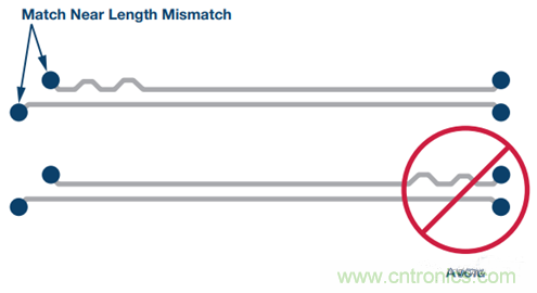 成對差分走線的長度須相同。此規(guī)則源自這一事實:差分接收器檢測正負信號跨過彼此的點,即交越點。因此,信號須同時到達接收器才能正常工作。