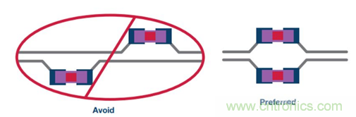 同一差分對內的走線間距在全長范圍內須保持不變。如果差分走線彼此靠近布線,它們將影響總阻抗。如果此間距在驅動器與接收器之間變化不定,則一路上會存在阻抗不匹配,導致反射。