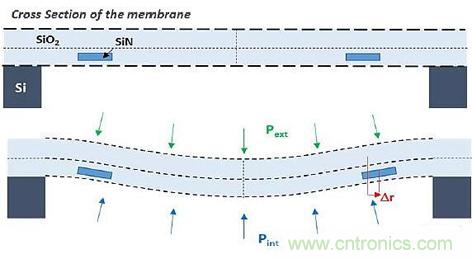 圖2:在這個微型光學(xué)壓力傳感器橫截面中,下半部分顯示了壓力下的彎曲。