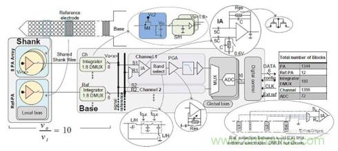 另外,目前的電子設(shè)計架構(gòu)也不是最佳。探針設(shè)計由大量小型有源電極組成,用于放大和緩沖神經(jīng)信號。CMOS像素放大器(PA)位于電極下方極小的空間內(nèi),由于空間不足,信號處理被迫在探針的底座完成。想象一下這種非理想信號路由中的噪聲問題,理想情況下希望信號處理緊挨著PA進行。