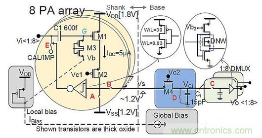 探針架構(gòu)設(shè)計(圖5)中的信號流,通過一條共享柄線從8個多路復(fù)用PA陣列的輸出流向底座。然后,該信號進入探針底座中的積分器,積分器的輸出通過8個標(biāo)記為Vo的采樣保持電路進行解復(fù)用。接下來,8個單獨的Vo中的每一個都進入自己的信道模塊,它們對信號進行放大和濾波,使得輸出僅有感興趣的頻帶。接下來,所有20個通道經(jīng)過多路復(fù)用并由10位逐次逼近寄存器式(SAR)模數(shù)轉(zhuǎn)換器(ADC)進行數(shù)字化,并發(fā)送至為ADC和多路復(fù)用/多路解復(fù)用器(MUX/DEMUX)提供時鐘的數(shù)字控制模塊。在此,所有ADC的并行輸出經(jīng)串行化后僅有6條數(shù)據(jù)線。