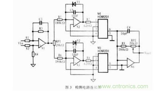在實(shí)際檢測(cè)電路的某一采集信道中,如需對(duì)一組差動(dòng)輸入信號(hào)進(jìn)行檢測(cè),可將電路接成如圖3所示的連接方式。圖中,通過放大器N1可將輸入的差動(dòng)信號(hào)變?yōu)閱芜呅盘?hào)后輸出。由于二極管V1和V2的作用,當(dāng)輸入信號(hào)為正時(shí),V2導(dǎo)通,V1截止,放大器N2呈開環(huán)狀態(tài),光耦N5工作,N4關(guān)斷;而當(dāng)輸入信號(hào)為負(fù)時(shí),則正好相反。當(dāng)HCNR201的第3、4端的光敏二極管受光后,其輸出信號(hào)將反饋到放大器的輸入端,以提高光耦的線性并減少溫漂。第5、6端輸出的信號(hào)經(jīng)運(yùn)放放大后輸出。電位器RP1的作用是調(diào)節(jié)運(yùn)放輸入偏置電流的大小。電容C2、C3為反饋電容,可用于提高電路的穩(wěn)定性,消除自激振蕩,濾除電路中的毛刺信號(hào),降低電路的輸出噪聲,其容值可根據(jù)電路的頻率特性來選取。放大器N6的作用是把光耦輸出的電流信號(hào)轉(zhuǎn)變?yōu)殡妷盒盘?hào)以供后級(jí)電路使用,并增強(qiáng)負(fù)載驅(qū)動(dòng)能力,降低輸出阻抗。調(diào)整電阻RP2的值可以調(diào)整信道的增益。