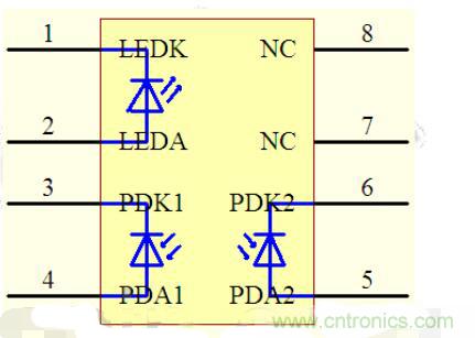 HCNR200/201包括一只高性能的發(fā)光二極管(圖中的LED),兩只極其相似的光電二極管(圖中的PD1和PD2)。當(dāng)LED中流過電流If時(shí)。其發(fā)出的光會(huì)在PD1和PD2中感應(yīng)出正比于LED發(fā)光強(qiáng)度的光電流Ipd1和Ipd2。由于PD1和PD2的特性非常相似,再加上安裝位置的精確性以及元件先進(jìn)的封轉(zhuǎn)設(shè)計(jì)保證了該元件的高線性度和增益的穩(wěn)定性。