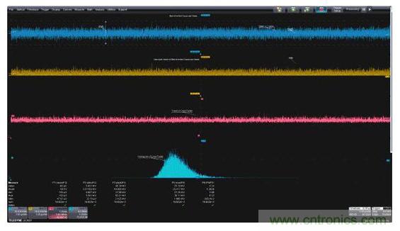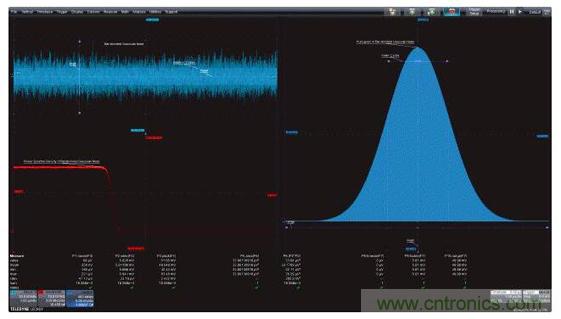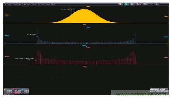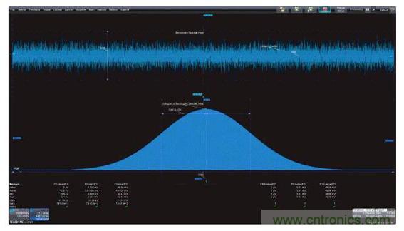 圖1:左上圖是帶寬受限的高斯噪聲的時(shí)域圖,左下圖是功率譜密度,是帶寬受限噪聲的頻域圖;右面的柱狀圖是帶寬受限噪聲的統(tǒng)計(jì)圖。這三個(gè)視圖都因采用了有助于對測量進(jìn)行量化的測量參數(shù)而得到增強(qiáng)。