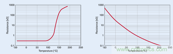 在超出某一特定溫度時,正溫度系數(shù) (PTC) 熱敏電阻(左圖)的電阻出現(xiàn)急劇升高,故而適合用作溫度限值