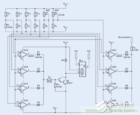2個開關(guān)閾值的參考值將通過2個微調(diào)器,即R7和R8(分別為2.2 k?)進(jìn)行設(shè)置。如上所述,兩個微調(diào)器將分別產(chǎn)生900?或550?的電阻。至于8個所需的比較器(U1A-U1D以及U2A-U2D),則采用經(jīng)濟(jì)型LM324放大器。在滿負(fù)荷跳線模式下進(jìn)行的一個持續(xù)數(shù)小時的測試表明,風(fēng)扇能夠在85℃時可靠地進(jìn)行開啟。由于系統(tǒng)具有相對較低的熱量期限,故而無需采用常用的滯回比較器電路。