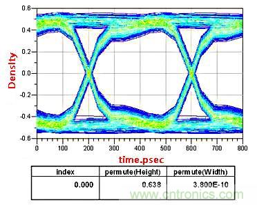 同樣的位置,與圖3相比可以看出增大耦合電容后,眼高變低。原因是“高速”使電容變的不理想。感應(yīng)電感會產(chǎn)生串聯(lián)諧振,容值越大,諧振頻率越低,AC耦合電容在低頻情況下呈感性,因此高頻分量衰減增大,眼高變小,上升沿變緩,相應(yīng)的JITTER也會增大。通常建議AC耦合電容在0.01uf~0.2uf之間,項目中0.1uf比較常見。推薦使用0402的封裝。