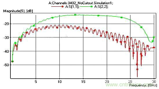 圖7圖8對比,在用ROGERS板材做隔層處理之后,相比未做隔層處理回波損耗下降到-30dB之內(nèi),大大降低了回波損耗,保證了信號傳輸?shù)耐暾?/div>