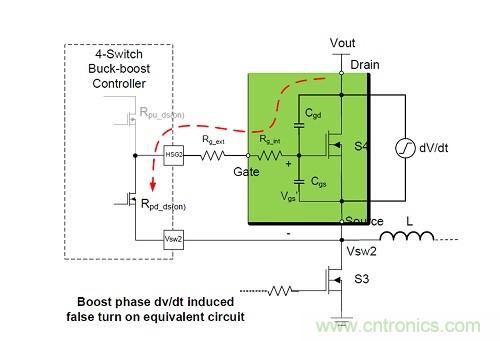 然后,這一問題在4開關(guān)降壓-升壓轉(zhuǎn)換器中翻了一番,因?yàn)樗袃蓚€(gè)階段——降壓和升壓。當(dāng)設(shè)計(jì)人員直接將降壓轉(zhuǎn)換器的電路參數(shù)復(fù)制到4開關(guān)降壓-升壓轉(zhuǎn)換器的升壓段時(shí),就會(huì)產(chǎn)生錯(cuò)誤。隨著這種拓?fù)浣Y(jié)構(gòu)在應(yīng)用中越來越受歡迎,了解dv/dt電感導(dǎo)通問題變得越來越重要。