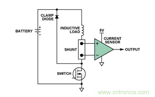 本例將詳細(xì)介紹一種典型的高端電流檢測(cè)應(yīng)用。圖1所示為汽車(chē)應(yīng)用環(huán)境中用于監(jiān)控電磁閥或其它感性負(fù)載的常見(jiàn)配置。