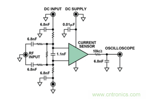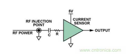 具體而言,這些測(cè)試都采用 “直接功率注入法”完成,這是一種通過(guò)電容將RF信號(hào)耦合至特定器件引腳的方法。根據(jù)待測(cè)IC的類(lèi)型,針對(duì)不同的RF信號(hào)功率水平和頻率范圍,測(cè)試器件的每路輸入。圖4顯示了在特定引腳上執(zhí)行直接功率注入測(cè)試的原理示意圖。