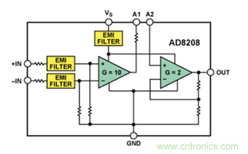 AD8208具有出色的交流和直流性能,且通過(guò)相關(guān)認(rèn)證,適合要求采用穩(wěn)定可靠的精密器件來(lái)改善系統(tǒng)控制的汽車(chē)應(yīng)用。失調(diào)和增益漂移典型值分別小于5 µV/°C和10 ppm/°C。該器件提供SOIC和MSOP兩種封裝,在DC至10 kHz范圍內(nèi)共模抑制比(CMR)最小值為80 dB。