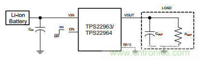 TI負(fù)載開關(guān)是用來接通和關(guān)閉電源軌的集成電子中繼器。大多數(shù)基本負(fù)載開關(guān)采用小型集成封裝,由四個(gè)引腳組成:輸入電壓、輸出電壓、使能、和接地,并且包含多重特性,其中有反向電流保護(hù)。圖4顯示了一個(gè)用來阻斷反向電流的負(fù)載開關(guān)。