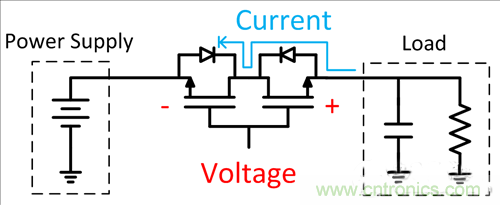 為了在FET關(guān)閉時(shí)阻斷兩個(gè)方向上的電流,你還可以將FET背靠背連接。與二極管解決方案相比,電源到負(fù)載的壓降更低,不過這種實(shí)現(xiàn)方式占用了大量的電路板面積。圖3顯示了用來阻斷反向電流的背靠背FET示例。