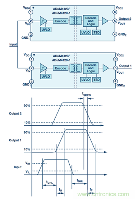 如圖5所示,傳播延遲偏斜被定義為器件間偏差。對于具有多個輸出通道的器件,此規(guī)格的表述方式相同,但被稱為通道間偏斜。傳播延遲偏斜通常不能在控制電路中予以補(bǔ)償。