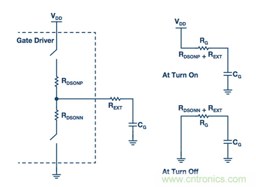 率。如圖4所示,高端導(dǎo)通電阻和外部串聯(lián)電阻REXT構(gòu)成充電路徑中的柵極電阻,低端導(dǎo)通電阻和REXT構(gòu)成放電路徑中的柵極電阻。
