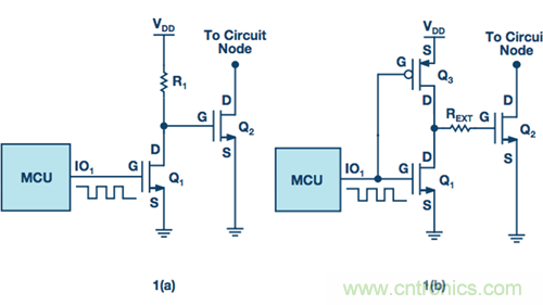 考慮一個具有微控制器的數(shù)字邏輯系統(tǒng),其I/O引腳之一上可以輸出一個0 V至5 V的PWM信號。這種PWM將不足以使電源系統(tǒng)中使用的功率器件完全導(dǎo)通,因?yàn)楣β势骷尿?qū)動電壓一般超過標(biāo)準(zhǔn)CMOS/TTL邏輯電壓。因此,邏輯/控制電路和高功率器件之間需要一個接口。這可以通過驅(qū)動一個邏輯電平n溝道MOSFET,其進(jìn)而驅(qū)動一個功率MOSFET來實(shí)現(xiàn),如圖1a所示。