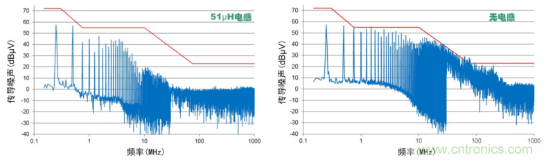 對(duì)于CAN接口的EMC問題,除了選用更好性能,符號(hào)要求的CAN收發(fā)芯片,另一種簡(jiǎn)單的方法就是對(duì)CAN接口增加外圍,共模電感是一種很好的選擇。在現(xiàn)有汽車電子CISPR 25標(biāo)準(zhǔn)中,對(duì)傳導(dǎo)騷擾限值有很嚴(yán)格要求。許多CAN收發(fā)器均會(huì)超過限值。如圖 5分別為按照車規(guī)限制測(cè)試增加和不加共模電感的CAN接口傳導(dǎo)騷擾,共模電感值為51μH,可以看到在各個(gè)頻段下對(duì)噪聲改善較為明顯,測(cè)試結(jié)果仍有很大裕量。