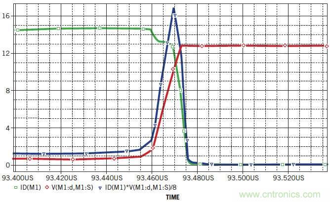 圖2:開(kāi)關(guān)Q 1產(chǎn)生I D(綠色)和V DS(紅色)的特征波形。這兩個(gè)波形的乘積給出了瞬時(shí)功耗P D(藍(lán)色)。