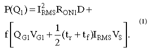 在等式1中,第一項(xiàng)反映了傳導(dǎo)損耗,第二項(xiàng)反映了動(dòng)態(tài)和柵極損耗。I RMS是漏極電流; R ON是溝道電阻; D是占空比; f是開(kāi)關(guān)頻率; t r和t f分別是切換上升和下降時(shí)間; 和V S是輸入源電壓。