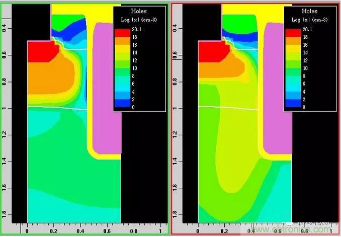 圖5:完全導通(左)和線性區(qū)的空穴分布圖