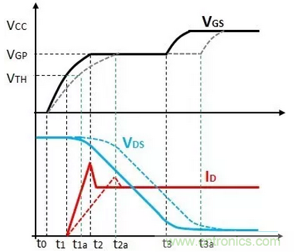 階段3(t2-t3)為米勒平臺(tái),VGS電壓保持米勒平臺(tái)電壓VGP,整個(gè)過程中,VDS電壓逐漸下降到低的電壓值,ID電流保持不變。