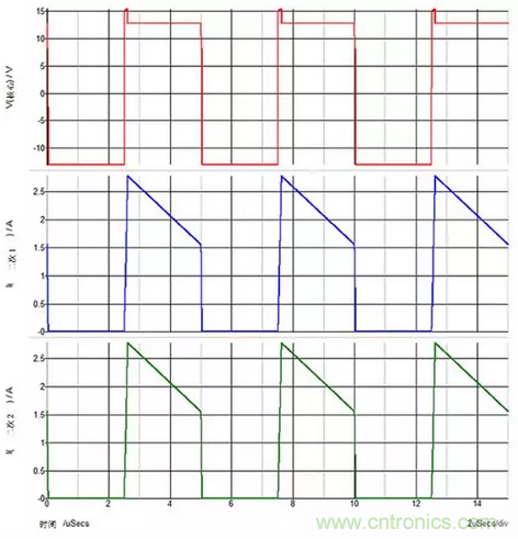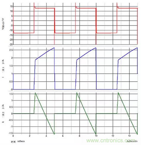 圖2:當(dāng)對兩個(gè)輸出施加重載時(shí),在整個(gè)1-D周期內(nèi),次級繞組電流在兩個(gè)次級繞組中流動(dòng)。您可以看到上方紅色跡線上的基座電壓。