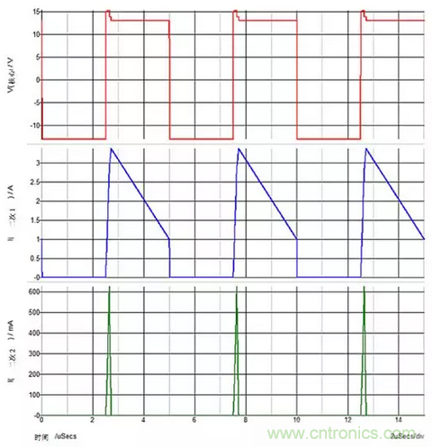 圖3:重載次級1和輕載次級2。基座電壓對次級2的輸出電容器進(jìn)行峰值充電。
