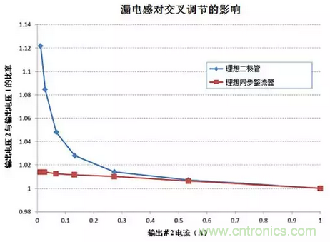 圖5:該圖顯示了兩個(gè)輸出之間的交叉調(diào)節(jié),其中1號輸出上的1-A負(fù)載保持穩(wěn)定,而2號輸出上的負(fù)載不斷變化,從而凸顯了同步整流器如何減輕漏電感的影響。