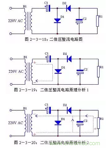 二倍壓整流電路還有另外一種形式的畫(huà)法,見(jiàn)圖2-3-21,其原理與圖2-3-18完全一致,只是表現(xiàn)形式不一樣。