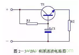 當(dāng)對(duì)濾波效果要求較高時(shí),可以通過(guò)增加濾波電容的容量來(lái)提高濾波效果。但是受電容體積限制,又不可能無(wú)限制增大濾波電容的容量,這時(shí)可以使用有源濾波電路。其電路形式見(jiàn)圖2-3-29,其中電阻R1是三極管T1的基極偏流電阻,電容C1是三極管T1的基極濾波電容,電阻R2是負(fù)載。這個(gè)電路實(shí)際上是通過(guò)三極管T1的放大作用,將C1的容量放大β倍,即相當(dāng)于接入一個(gè)(β+1)C1的電容進(jìn)行濾波。