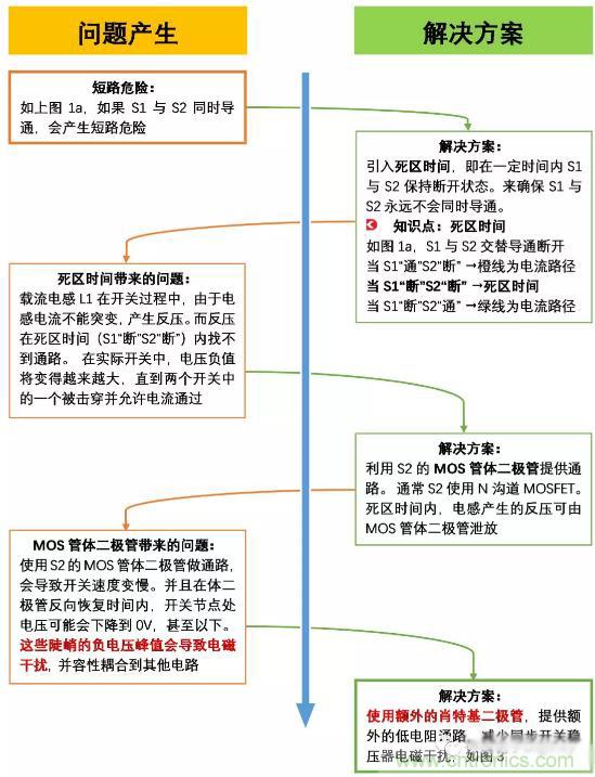 同步開關(guān)穩(wěn)壓器有一個天生的缺陷,就是當(dāng)S1與S2同時導(dǎo)通時,會產(chǎn)生短路危險,這會損壞開關(guān)。所以必須確保兩個開關(guān)永遠不會同時導(dǎo)通。為了個避免這種情況發(fā)生,會采取一些措施,而這些措施可能會帶來額外的電磁干擾。我們來梳理一下這個過程是如何發(fā)生的。