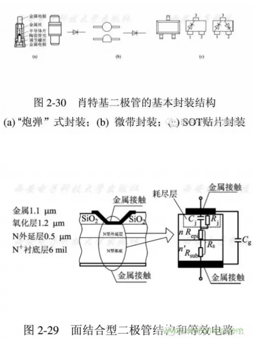 因此性能穩(wěn)定,一致性好,不易損壞。圖中給出一種面結(jié)合型二極管的結(jié)構(gòu)圖和等效電路。從中可以看出各部分的結(jié)構(gòu)尺寸量級。通常這種管芯要進(jìn)行封裝才能方便地使用。肖特基勢壘二極管的典型封裝結(jié)構(gòu)可采用“炮彈”式、微帶式、SOT貼片式等如圖2-30所示。