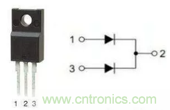采用TO–220或TO–3P封裝的大功率快恢復(fù)二極管,有單管和雙管之分。雙管的管腳引出方式又分為共陽和共陰。