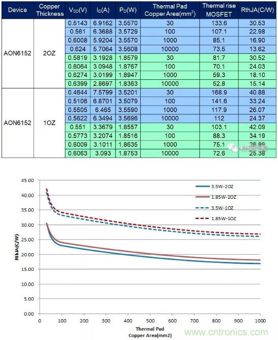 下面分別以一塊10cmX10cm、2OZ覆銅的二層PCB板來做試驗,板厚1.5mm,PCB底層覆銅沒有通過過孔連接到頂層,將封裝為DFN5*6器件AON6152焊接在PCB板,同時AON6152的D極下面分別鋪設四種不同尺寸的銅皮:30mm2、100mm2、1000mm2、10000mm2。然后給四塊板的AON6152灌入相同的功率,測量AON6152的溫升,計算相應的熱阻RJA。將AON6152灌入功率減小一半,重復上面的實驗,測量其溫升,再次計算相應的熱阻RJA。