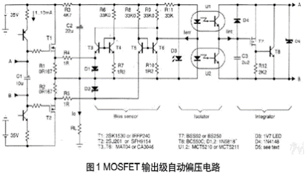 MOSFET的偏壓視實際使用的管子而定,通常在2V至10V間變化。為了應(yīng)對這一范圍,最終確定圖1 所示的自動拓?fù)浣Y(jié)構(gòu)。積分器采用積分并聯(lián)穩(wěn)壓器,不僅結(jié)構(gòu)簡單,而且有較高的精度,還顯示出足夠低(<2Ω)的動態(tài)輸出阻抗,能滿足來自驅(qū)動級AC電流的要求。為了排除高頻處的交互作用,積分電容C3的取值應(yīng)使伺服環(huán)的單位增益頻率低于音頻譜。通常在1Hz與10Hz之間,具體數(shù)值取決于光耦合器的傳輸比,D4的作用是在管子截止期間讓C3放電,從而保護T7的柵極,想要可靠地工作;積分器輸入端低漏電是至關(guān)重要的,因此D4應(yīng)避免光照。穩(wěn)壓二級管D5額定值為最大可能偏壓加上少量的余量,以適應(yīng)特定設(shè)計的要求。倘若某個元件發(fā)生故障,或加以極端的測試信號,該二級管能保護輸出級免受過大共模電流的損害。